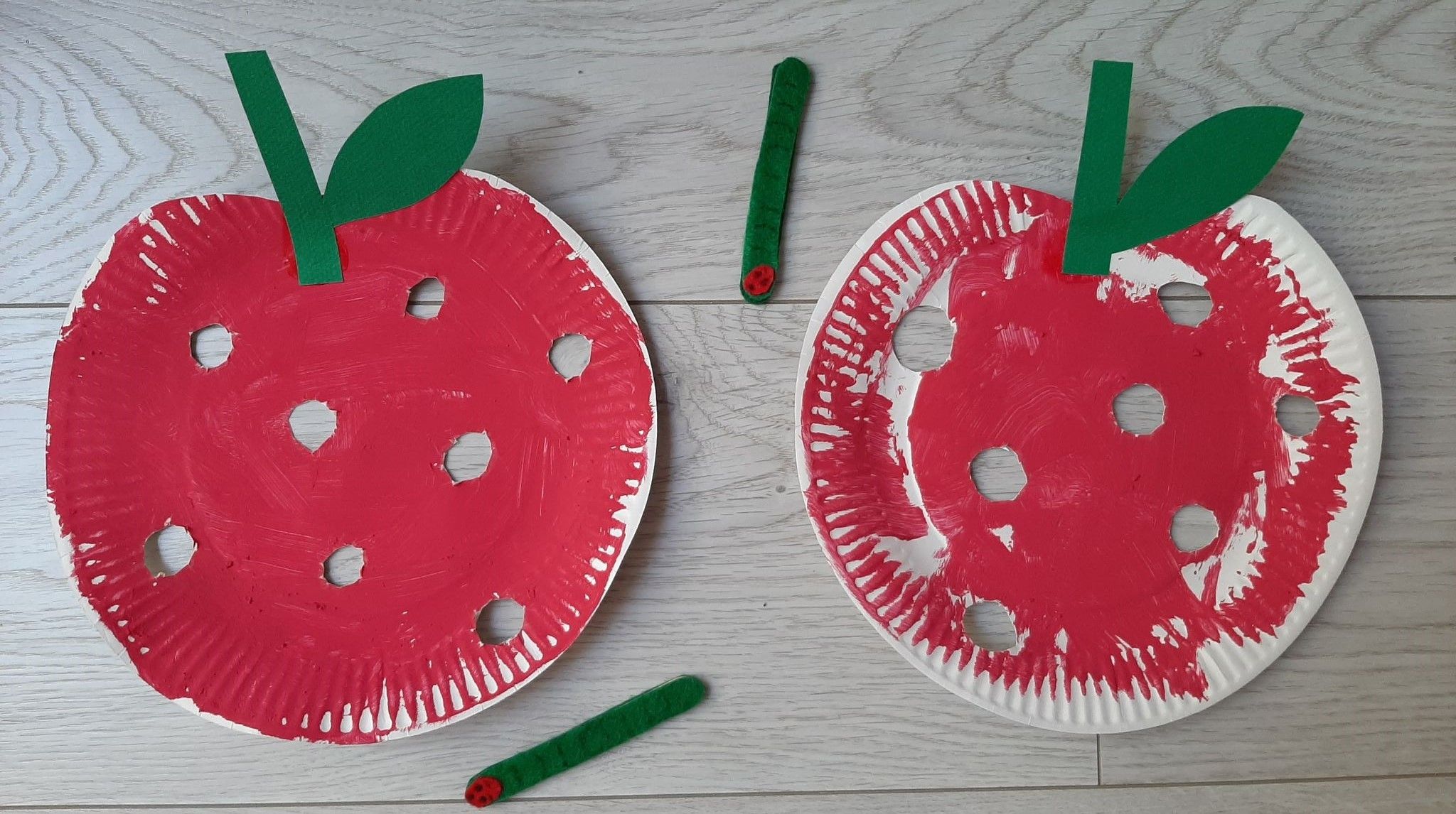 Le livre "La chenille qui fait des trous" a eu énormément de succès auprès de mes Cocos . Pour illustrer l'histoire, les petits ont peint en rouge une assiette en carton. J'ai découpé des trous dans cette assiette. Nous avons collé ensemble la feutrine verte sur les bâtons de glace . Les Cocos se sont bien amusés à passer la petite chenille dans les trous et faire comme si elle dévorait tout sur son passage !