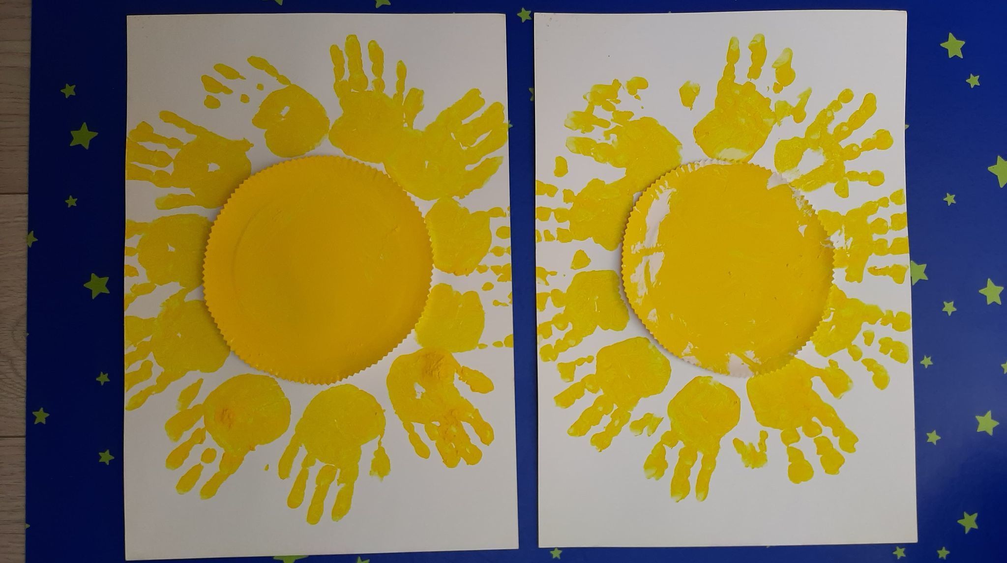 Les Cocos ont d'abord peint une assiette en carton en jaune. Après l'avoir découpée aux ciseaux cranteurs , nous l'avons collée sur le support puis fait les empreintes de main pour symboliser les rayons du soleil .