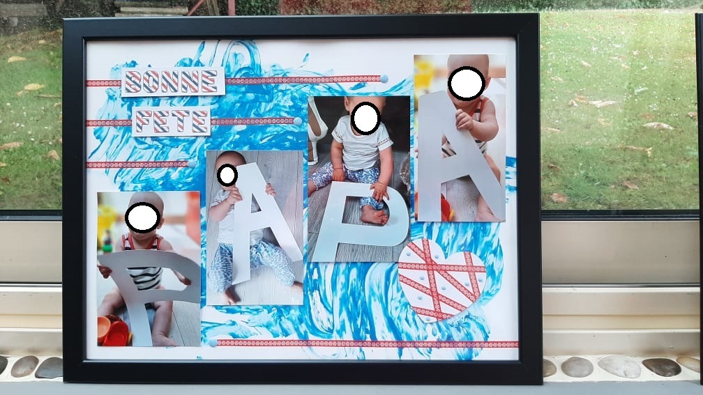 Pour la réalisation de ce cadeau pour la fête des Papas nous avons surtout fait une super séance photos avec les lettres fabriquées avec des cartons . Le fond a été peint avec les mains et Adrien a colorié un joli cœur !