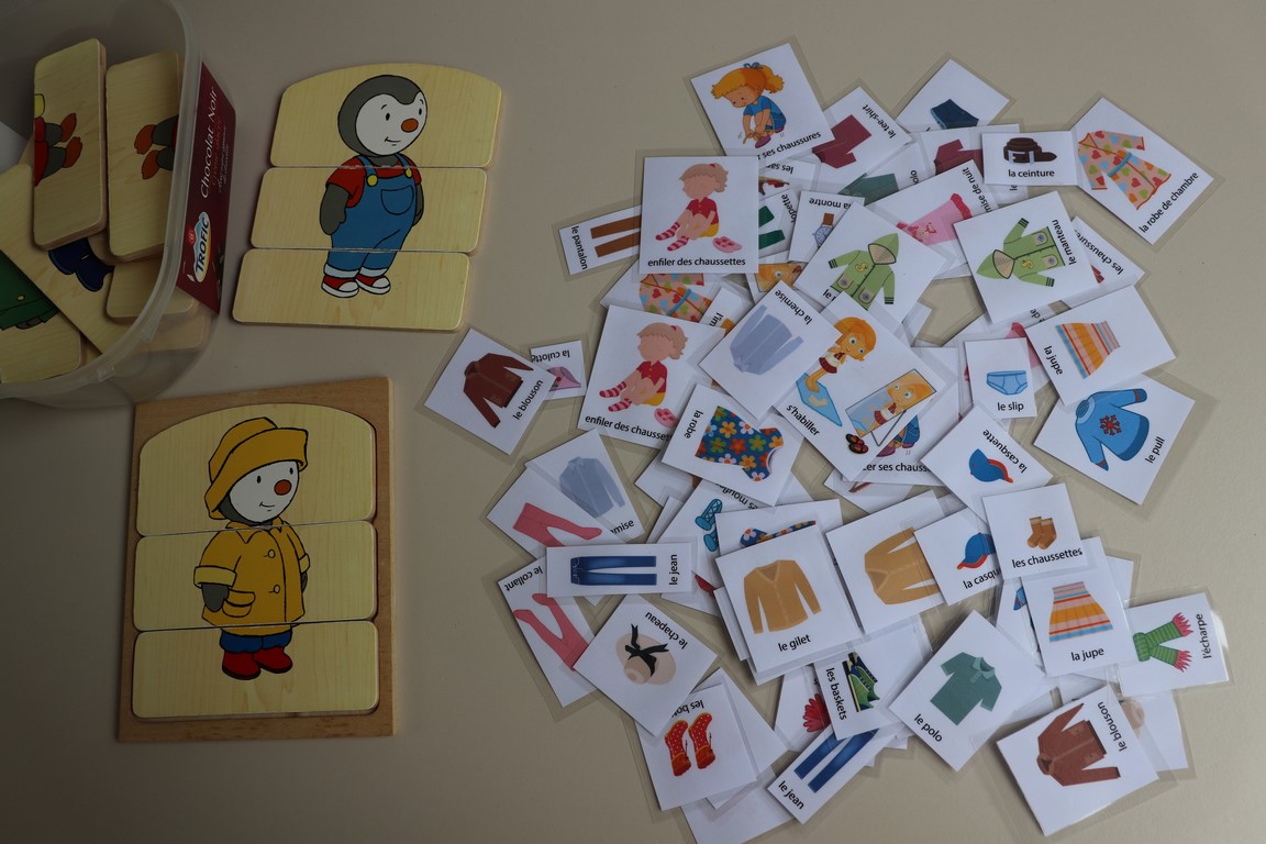 On a commencé par nommer les vêtements puis les Cocos ont remarqué qu'ils pouvaient retrouver les paires. Ils ont aussi beaucoup joué avec le puzzle en bois de T'Choupi .