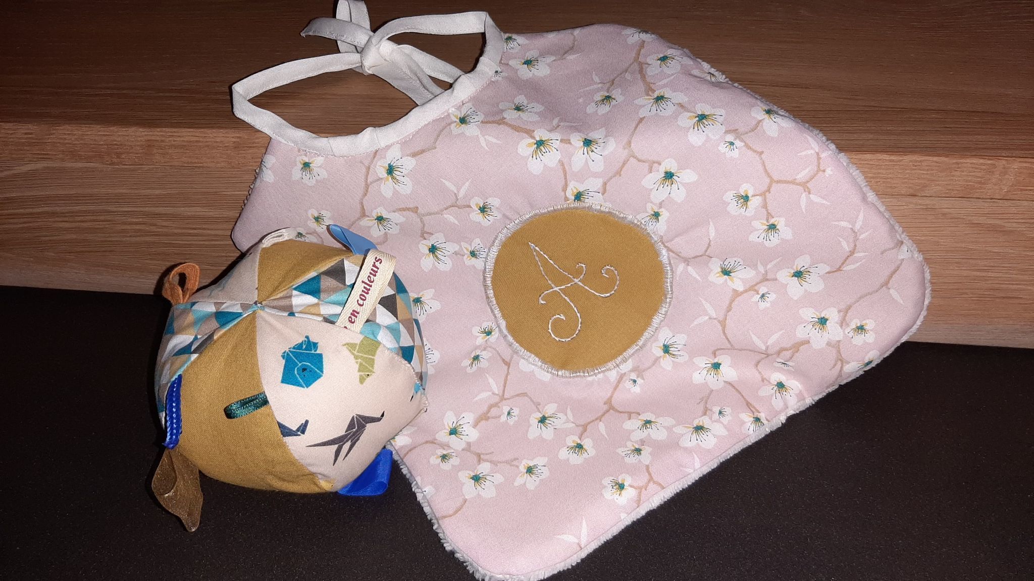 Voilà le traditionnel cadeau pour la jolie Anaé qui passe déjà quelques petits moments chez Nounou ! Le bavoir et la balle à étiquettes sont toujours utiles !
